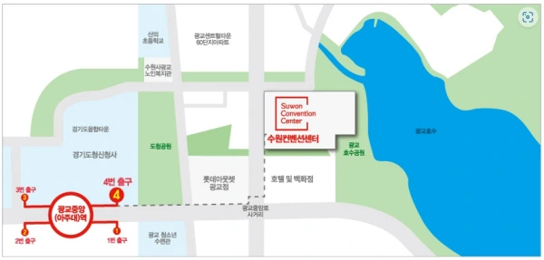 - 서울역 M5115, M5121 / 강남역 M5422 → 광교중앙·아주대환승센터 하차 → (4번 출구, 도보 10분) → 수원컨벤션센터 도착